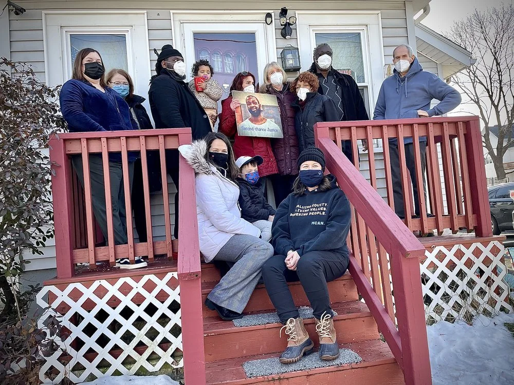 Members of William Allen’s legal team join Thurston Allen and Frances Bynoe on their front porch following the press conference along with leaders of Second Chance Justice and staff from Brockton Interfaith Community and Massachusetts Communities Action Network.